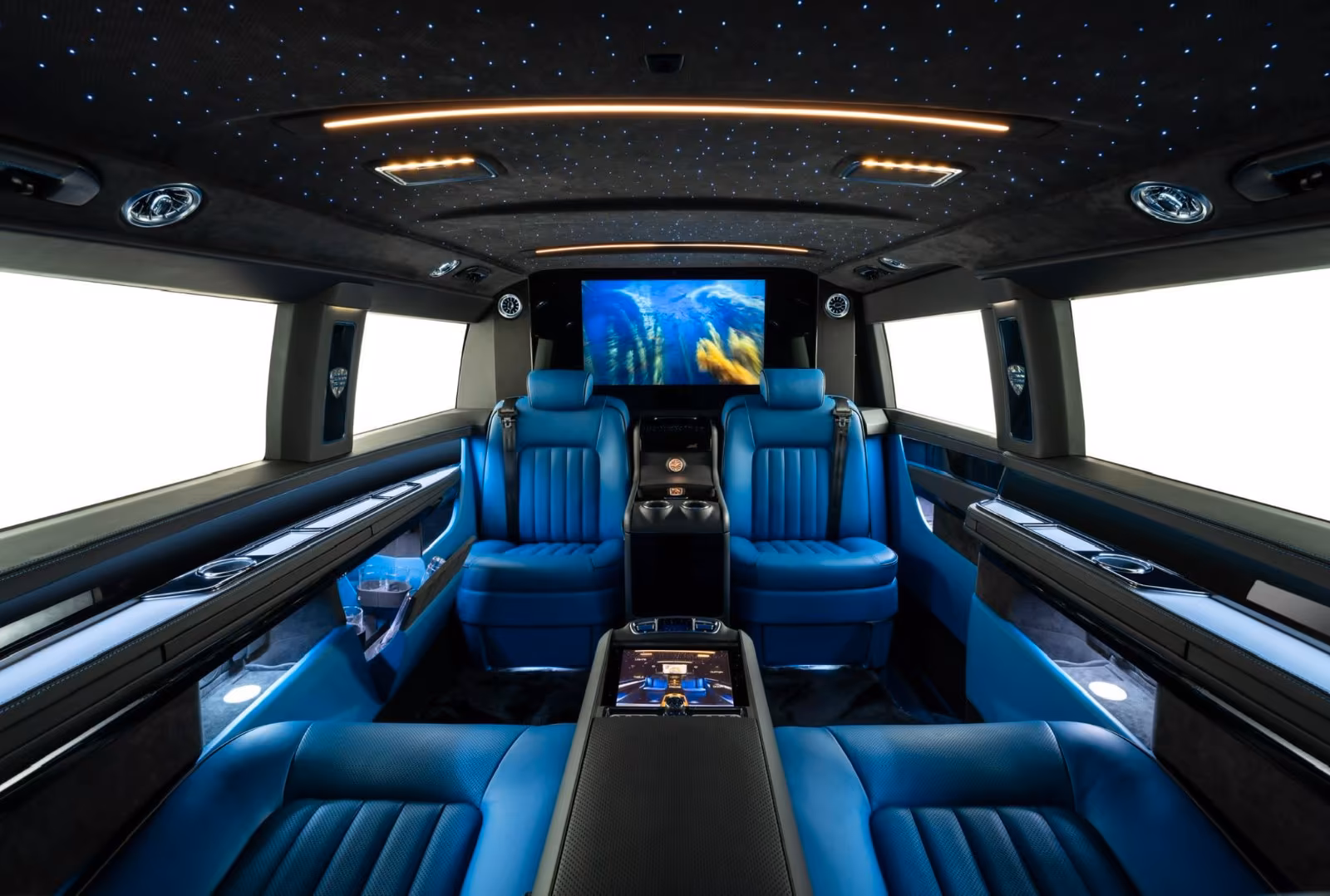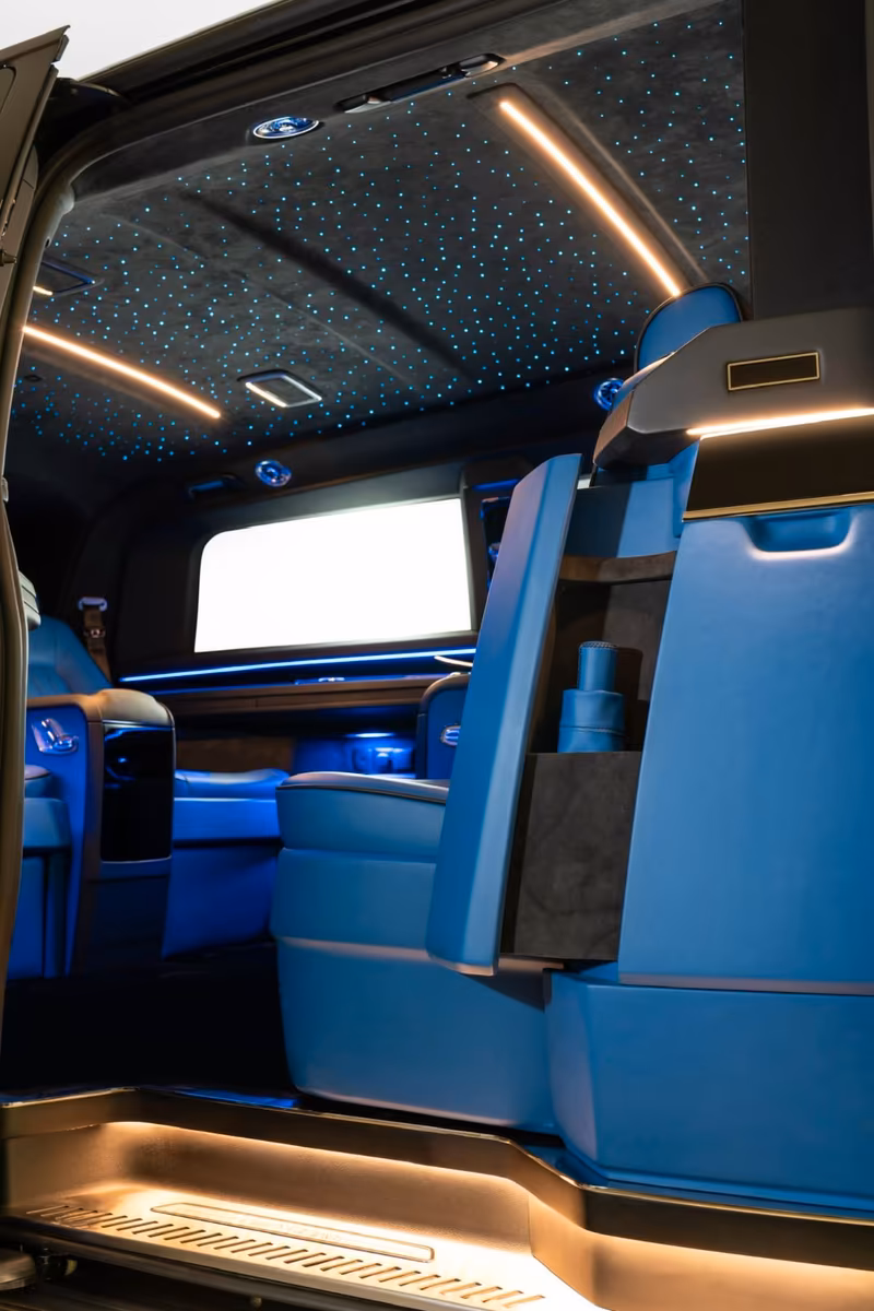 • Nach vorne gerichtete, zweiteilige First-Class-VIP-Sitze im Flugzeugstil in Kingsize-Größe, extra groß und ergonomisch geformt mit hochwertiger Schaumstoffkonstruktion für außergewöhnlichen Komfort; bezogen mit Bentley-inspiriertem Vollnarben-Nappaleder